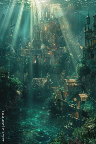 Enchanting Underwater Fantasy City with Sunlight Beams and Mystical Architecture