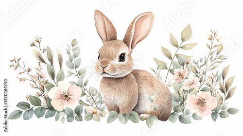 Enchanting Watercolor Rabbit with Delicate Blush Flowers