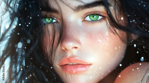 Enchanting Young Woman with Sparkling Green Eyes and Flowing Hair