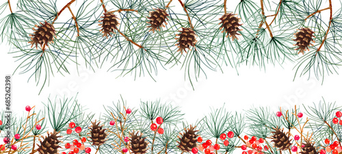 Endless border, pattern with viburnum berries, rowan berries, pine and spruce branches, cones. Watercolor art illustration on a white background. For cards, handmade textiles, prints, menus, posters.
