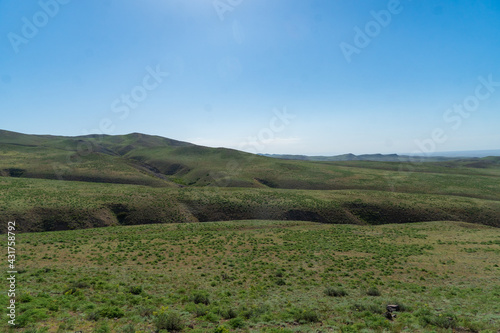 Endless steppe in the valley at the foot of the mountains, bathed in bright sunlight. Amazing view on green mountains. mountain, covered with green trees, under a blue sky with clouds.