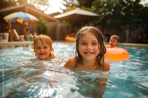 Energetic children swimming and splashing in a backyard pool, sun setting in the background
