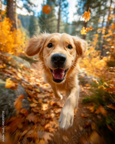 Energetic golden retriever running toward the camera on a forest trail blanketed with autumn leaves motion blur in paws, joyful expression, surrounding trees in golden hues