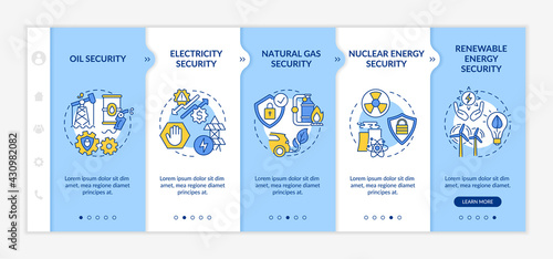 Energetic security types onboarding vector template. Responsive mobile website with icons. Web page walkthrough 5 step screens. Electricity, nuclear energy color concept with linear illustrations