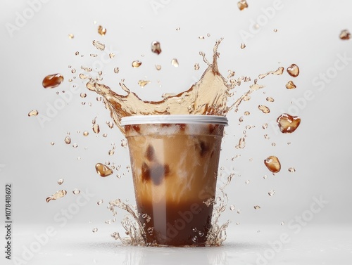 Energizing iced espresso splashing over the side of a foam-topped cup.