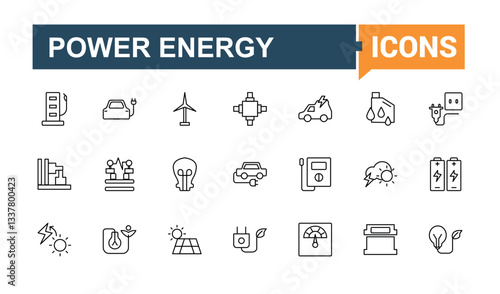 Energy and Power icon. Includes thin line save, green, ecology, electric, efficiency and more. Icons for UI design. Electricity icon set. Vector artwork and illustration.