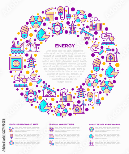 Energy concept in circle with thin line icons: factory, oil platform, hydropower, wind energy, power socket, radioactivity, garbage, oil rig, recycling. Vector illustration, web page template.