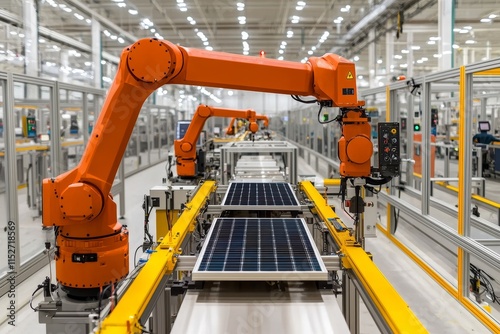 Energy-efficient manufacturing technology. Automated machinery in a solar panel production facility.