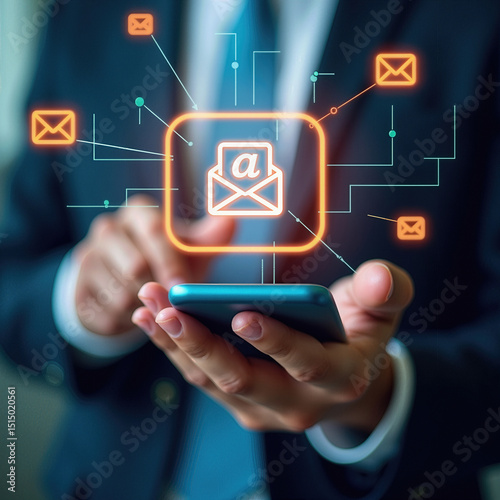 Engage in digital communication with a smartphone showing a glowing network of email icons, symbolizing online connectivity, business messaging, and modern technology.