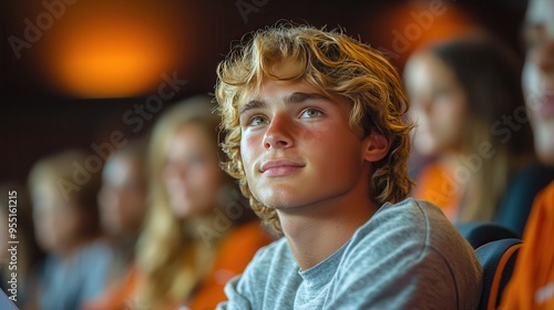Engaged Student Taking Detailed Notes in Front Row of Classroom During Lecture