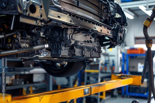 Engine Removal Using Hydraulic Lift in Auto Shop - Precision Mechanical Engineering Scene