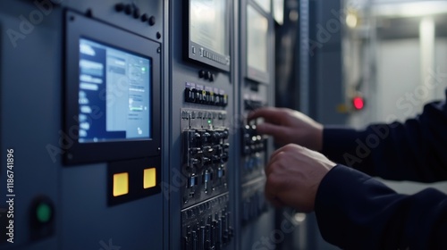 Engineer adjusts controls on a complex panel, managing industrial processes within a manufacturing or processing plant, highlighting expertise in automation and technology