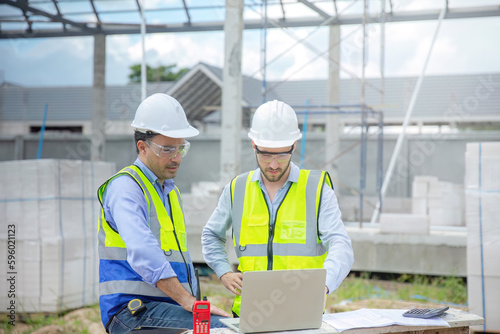Engineer and architect on construction site, A foreman works with an architect or structural inspector on a large residential construction site