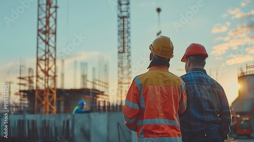 Engineer and foreman worker checking project at precast factory site Engineer and builders in hardhats discussing on construction site : Generative AI