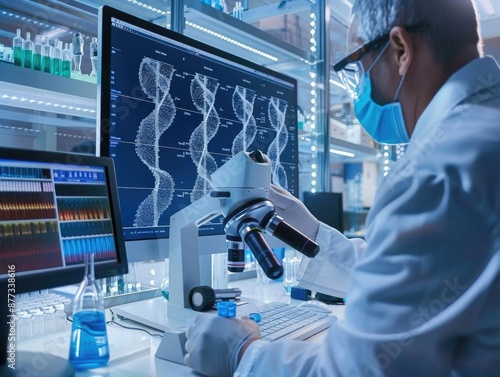 Engineer in biotech lab, analyzing DNA sequences on computer, advanced microscopes and lab equipment