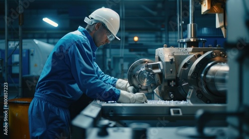 Engineer in blue jumpsuit and white hard hat lathe Checking machinery in the factory