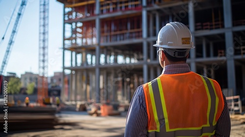 Engineer in Helmet at Construction Site, Looking Up with Crane and Building in Background