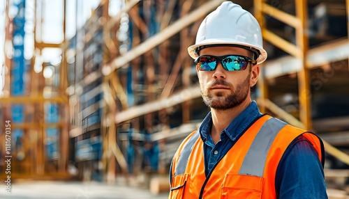 Engineer in helmet, reflective vest and sunglasses o construction background.