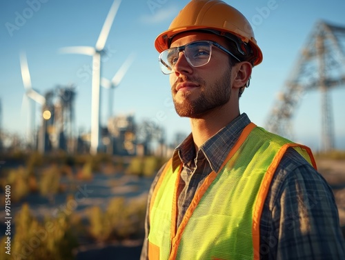Engineer in neon vest, standing confidently with wind turbines behind, bright blue sky, clean energy vision with realistic photo and captured with Canon EOS 5D Mark IV, 125mm lens