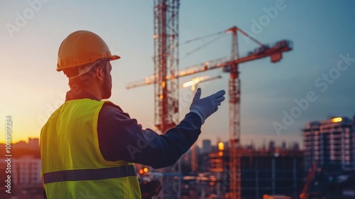 Engineer in safety gear discussing construction methods with a team, with a building site and construction equipment in the background