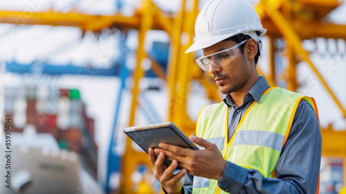 Engineer in safety vest and hard hat overseeing container shipping operations at port