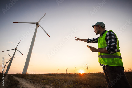 Engineer in safety vest pointing towards wind turbines at sunset, concept of renewable energy development and sustainable power control.
