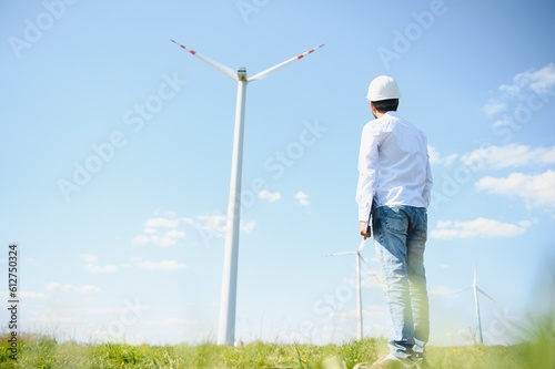Engineer India man working at windmill farm Generating electricity clean energy. Wind turbine farm generator by alternative green energy. Asian engineer checking control electric power