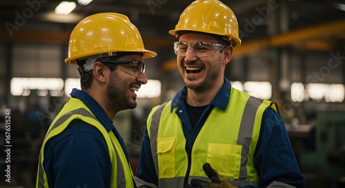 Engineer industrial product designer discuss work while in office , Happy engineer discussing with colleague in industry