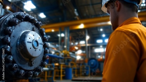 Engineer Inspecting a Large Industrial Machine Component on a Factory Floor