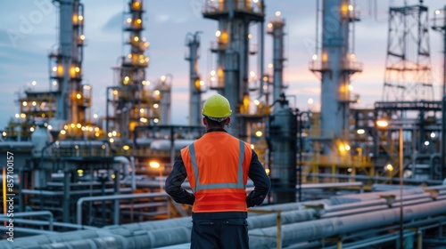 Engineer inspecting in industrial oil refinery, stand with back Industry 4.0 concept, Background blurred concept