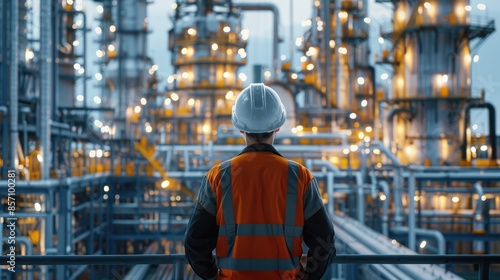 Engineer inspecting in industrial oil refinery, stand with back Industry 4.0 concept, Background blurred concept