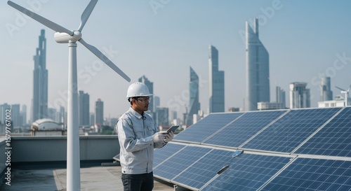 Engineer Inspecting Solar Panels and Wind Turbine on a City Rooftop