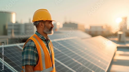 Engineer Inspecting Solar Panels at Sunrise. Engineer in a hard hat inspects rooftop solar panels at sunrise, ensuring optimal performance in an urban setting.