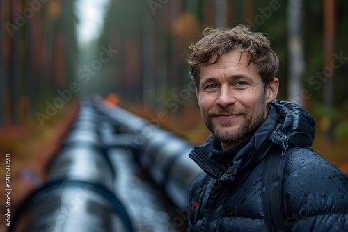 Engineer inspects large water pipe installation at construction site for drainage quality standards