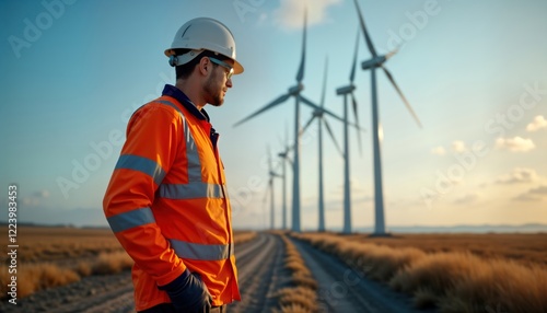 Engineer inspects wind turbines on open field. Man in safety gear observes wind farm in the countryside. Worker looks at windmills at sunset. Alternative eco energy concept. Modern tech innovation.