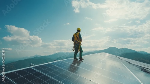 Engineer installing solar panels on the roof, the concept of producing alternative renewable green energy