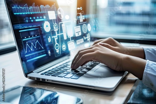 Engineer interacting with advanced humanoid robot in a high-tech laboratory, analyzing data on a futuristic digital screen with holographic interface