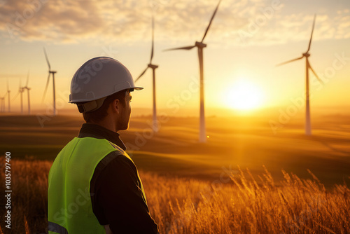 Engineer is admiring a field of wind turbines at sunset