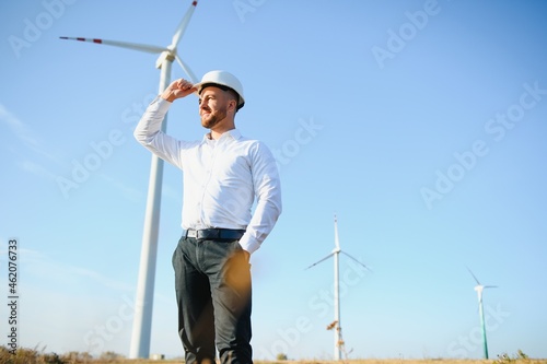 Engineer is checking energy production on wind turbine. Worker in windmills park in helmet.