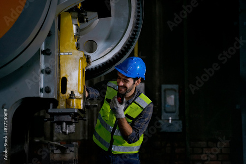 Engineer is working at machine part factory.