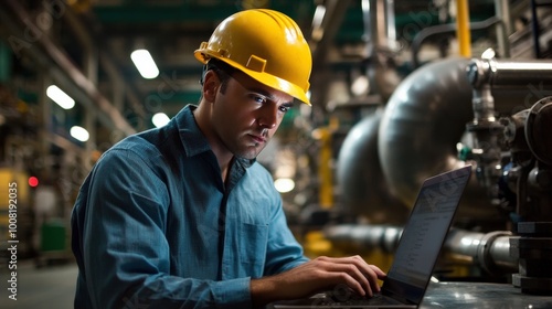 Engineer Monitoring Factory Equipment with Laptop, Industrial Setting