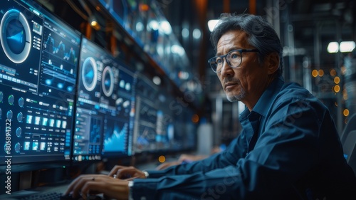 Engineer monitoring the production process. The process of production management using modern technologies.