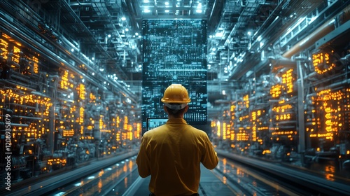Engineer observes advanced technology in a high-tech facility, illuminated with lights.