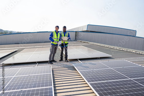 Engineer on rooftop stand next to solar panels discussion with team check laptop for installation