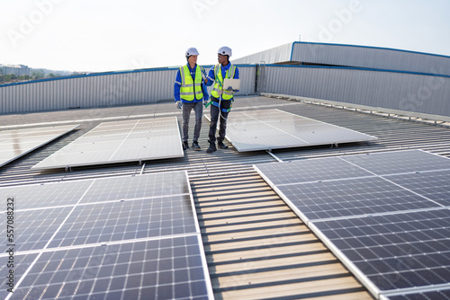 Engineer on rooftop stand next to solar panels discussion with team check laptop for installation