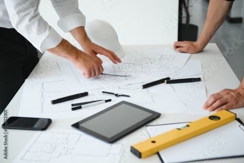 Engineer or architect teamwork working on construction project with building model and blueprint in office. Construction concept.