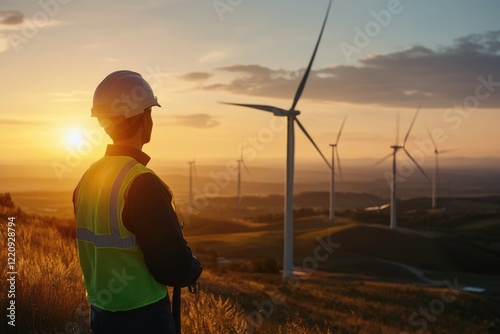 Engineer overlooking a sunset wind farm, signifying sustainable energy and renewable resources.