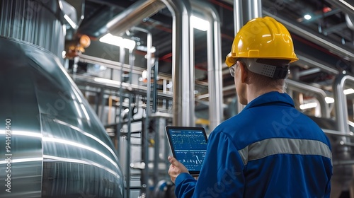 Engineer Overseeing Food and Beverage Production Line with Digital Tablet