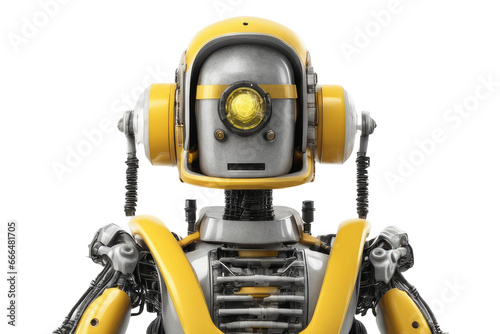 engineer robot wearing yellow safety helmet isolated on a white background