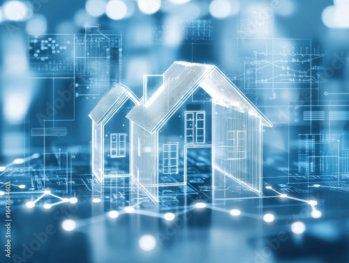 Engineer structural research Concept. Digital illustration of houses with tech elements on a blue background.